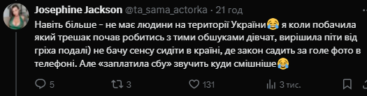 "Факт: люди долб**бы", — лаконично ответила на подобные комментарии Сенюк в социальной сети. Напомним, что получить уголовную ответственность в Украине можно за публикацию голых фото в интернете. Детальнее "Телеграф" разбирался в материале: "За видео "18+" наказание, как за убийство: когда могут декриминализировать порно и кто против".