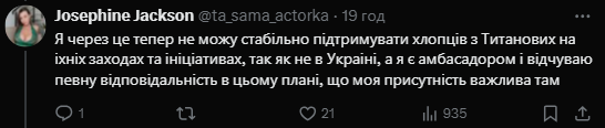 Я поэтому теперь не могу стабильно поддерживать ребят из Титановых на их мероприятиях и инициативах, так как не в Украине, а я являюсь послом и чувствую определенную ответственность в этом плане, что мое присутствие важно там