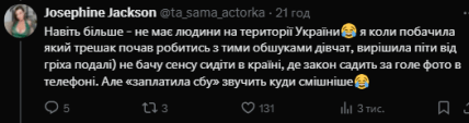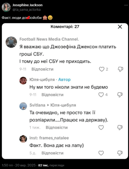 О своем решении Джексон заявила в соцсети X. Его причиной стали нападки некоторых украинцев, которые заявляют в интернете о связях Юлии с СБУ. Якобы правоохранители не трогают порноактрису из-за взяток.