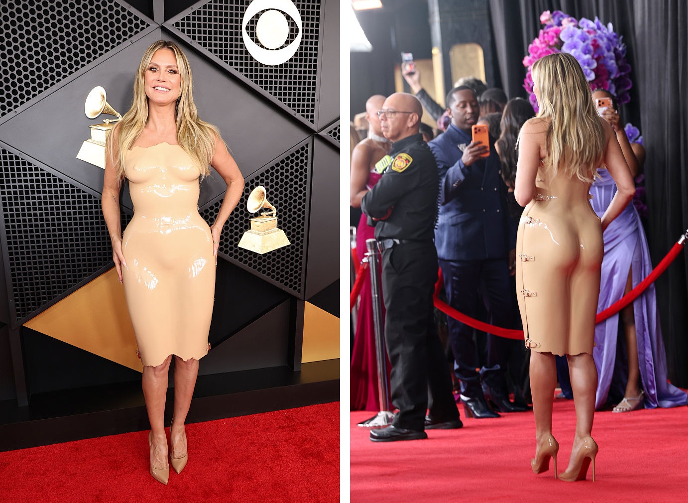 Модель Гайді Клум — велика любителька епатажу та екстравагантності на червоних доріжках. Не стала зраджувати собі модель і на Греммі-2026, з’явившись на премію в манекені. Вона буквально ледве переміщалася через незручність такої пластикової сукні, але виглядала дуже органічно і навіть епічно. Наряд-манекен повторював усі вигини тіла Гайді Клум і виглядав "голим", проте вона почувалася в ньому дуже впевнено.